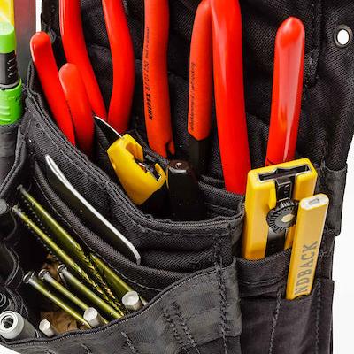 What Fits: Hand Tools, Small to Medium Tape or Chaulk Line Pencils, Knife, Driver and Drill Bits